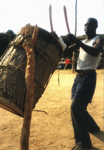 A drummer from one of Luke Mulumba's later teams, demonstrating a Kalela