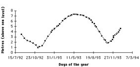 The variation in the height of the River Amazon at the Port of Óbidos, with measurements taken between 1992 and 1994.