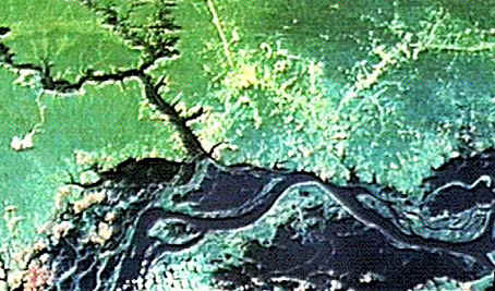 This is an aerial photograph of an area in the Lower Middle Amazon. The dark parts are rivers and lakes. Moving from left to right is the Amazon river and from top left down to mid is the Trombetas river. The area of my fieldwork is the triangle in the middle of the picture with the lake in the middle. Obidos and Oriximiná, two towns of about 20000 inhabitants are the yellowy areas in the centre top half.A road and many settlements log it join the two towns. It is about 120 km from one end of the picture to the other. The Costa do Parú, coast of Parú to give its full name, runs roughly east-west along the banks of the River Amazon for about 32 kilometres (about 20 miles). To the immediate north lies a series of lakes and floodplain ground of various heights, which also are part of the complex of Parú. The whole area is effectively a triangle, with rivers acting as the boundaries, on the south side the Amazon and on either side the Trombetas and Cachoerri rivers. However, the area known as Parú by locals refers only to the Costa do Parú; the other sides of the triangle have other names. The triangle is effectively a receptacle, with various out/inlets: the lake being the water trapped inside. The sides of the triangle are the natural river embankments or the floodplain levées (restinga). These are the highest ground of the floodplain and it is usually only upon the levees that houses are built.