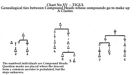 Compound ClustersThe term "Compound Cluster" will be used to refer to a collection of compounds whose inhabitants act as a unit for certain purposes. To my knowledge, there was no word in the Mambila language which refers specifically to such a cluster. The inhabitants of a cluster are usually referred to as the inhabitants of a named place, the named place being the area of the hamlet in which the cluster is to be found. The constituent compounds, as the name implies, are usually in close proximity one to the other. I would estimate that the greatest distance separating any two compounds of the same cluster would be from 150 to 200 yards. In most cases, clusters are much more compact. Chart X, at the end of this section, shows in graphic form the range in size of clusters in terms of the number of constituent compounds. Out of the total of 21 compound clusters in Warwar, 17 are made up of from 2 to 3 compounds. The smallest includes only 2 while the largest cluster is composed of 5 compounds. Chart XI, at the end of this section, shows the range of population for all of Warwar clusters. The average population per cluster is 22. A breakdown of this figure gives the following averages: 5 unmarried men, 5 married men, 5 unmarried women, and 7 married women per cluster. The fact that there is a ratio of 7 married women to 5 married men should not be taken to mean that the incidence of polygyny is anywhere near the order that these figures would imply. Women, as well as men who have at one time been married, or have borne children, are here classed as married females, even if they were at the time of the census single. Many of the women classed as married are single at the present, either having returned to the compounds of their own kinsfolk after an unsuccessful marriage, or being past the childbearing age and being unable or unwilling to remarry after a divorce or the death of a spouse. There are more women in the above two categories than men. 60 out of a total of 89 compounds in Warwar form a part of a cluster. Most of these which do not, are somewhat isolated geographically, that is are at quite a distance from the nearest compound. A few are located fairly near to a cluster but do not form a part of it. More will be said about this at a later state in this section. It should, however, be mentioned here that there are no clusters in one part of Tiket. This area is about four miles from the main body of the hamlet. The 9 compounds located there are not built as near one to the other as is the case for the majority of compounds in the parent settlement. The residents consider themselves to be members of Tiket, and only temporarily located at such a distance from most of their fellow hamlet-dwellers. The head of the component compounds of a cluster are usually kin. The genealogies given at the end of this section show the type of relationship existing between all of the compound heads, whose compounds for a part of a cluster, with the other heads of compounds in their cluster. The ties linking compound heads whose compounds form a part of a cluster are found to be agnatic, uterine, mixed cognatic and affinal. They are: