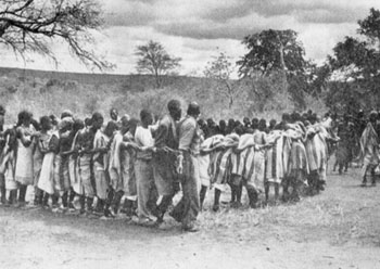 Domba at Makonde had recently begun when this photograph was taken in 1956. The drums had not yet been 'cooked' and hung, and the novices could wear only their pubic aprons. They have assembled at sunrise and are preparing to dance.